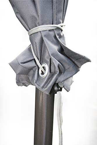 Kenmerken: de afdekking voor parasols tot Ø 300 cm is voorzien van twee ogen boven en onder aan de beschermhoes. Zo kan je parasol ook onder de hoes ademen en wordt schimmelvorming door vorming van condenswater voorkomen. Bovendien is er een witte band in de hoes verwerkt om deze zo dicht mogelijk aan de parasol vast te kunnen zetten. Het grijze koord dient als afsluiting om het onderste deel van de hoes aan de parasolstang te kunnen binden.