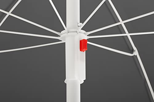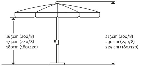 Schneider IBIZA parasol ca. 200 cm Ons scherm model Ibiza is een parasol die met zijn klassieke kleuren je terras, tuin of balkon optisch accentueert. Deze parasol is gemakkelijk in gebruik en bovendien verkrijgbaar in drie verschillende maten. Daardoor is ook zeker de juiste maat voor jou bij de hand. Ibiza – klassiek design De Ibiza paraplu is een ronde paraplu met een diameter van ca. 200 cm. De bekleding bestaat uit 100% polyester en is bestand tegen verrotting. De stofdikte bedraagt 150 g/m². De hoes beschikt bovendien over een volant, die met een bandrand is afgesloten. Door de waterafstotende impregnering is de bekleding ook bestand tegen een lichte bui en is hij in een handomdraai weer gedroogd. Het scherm Ibiza is getest op basis van de Australisch-Nieuw-Zeelandse norm AS/NZS 4399 en beoordeeld met beschermingsfactor 50+. Daardoor wordt met dit product een uitstekende bescherming tegen de zon geboden. Bijzondere kenmerken: het frame is wit gepoedercoat, heeft een 2-delige stok met een diameter van ca. 22/25 mm en sluit af met een mooi gevormde top. Door de schuiver met knop is het gemakkelijk en aangenaam openen of sluiten van het scherm mogelijk. Bovendien beschikt het scherm Ibiza over een draaivastzetter waarmee je de hoogte probleemloos naar behoefte kunt verstellen. Alle kunststof onderdelen zoals de top, de schuiver en de draaivastzetter zijn gemaakt van wit kunststof, dat aan het frame is aangepast. Bovendien heeft het scherm een knikker, waardoor deze kan worden afgestemd op de zonnestraling. Accessoires Om een veilige en stabiele stand te garanderen, adviseren wij een parasolhouder met een minimumgewicht van ca. 20 kg, bijvoorbeeld art. 877-15 betonstandaard ca. 20 kg antraciet of art. 877-14 betonstandaard ca. 20 kg zilvergrijs (niet inbegrepen). Als alternatief kun je ook de volgende artikelen met betrekking tot dit model gebruiken: tafelklem (art. 801-00), balkonklem (art. 802-00), parasolhouder Foxi of Maxi (art. 804-00 of 807-00), gazonhoorn (art. 803-00), gazon-vierzag (art. 863-00), standaard voor wegplaten in de afmetingen 40 x 40 cm of 50 x 50 cm (art. 837-15, levering zonder platen), balkonbetonstandaard ca. 20 kg zilvergrijs (art. 889-14), betonstandaard ca. 30 kg antraciet (art. 878-15), graniet balkonstandaard ca. 25 kg (art. 865-00), granietstandaard ca. 30 kg (art. 867-00) of PE-standaard ca. 20 liter. om te vullen met zand of water (art. 855-01 wit of 855-15 antraciet. Bovendien adviseren wij het gebruik van een beschermhoes bij niet-gebruik of regen, omdat je de levensduur van je scherm daardoor verhoogt en langer plezier van het gekochte product zult hebben. De beschermhoes kun je er ook apart bij kopen (art. 817-00). – Alleen voor privégebruik buitenshuis.