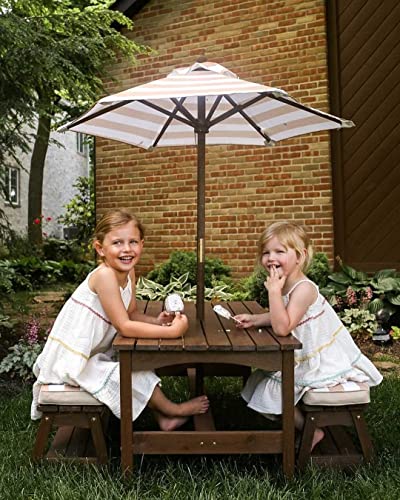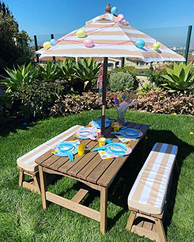 KidKraft 500 Picknicktafel met bankenset, inclusief kussens en parasol, kindermeubilair, havermout met wit gestreept